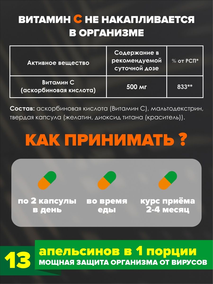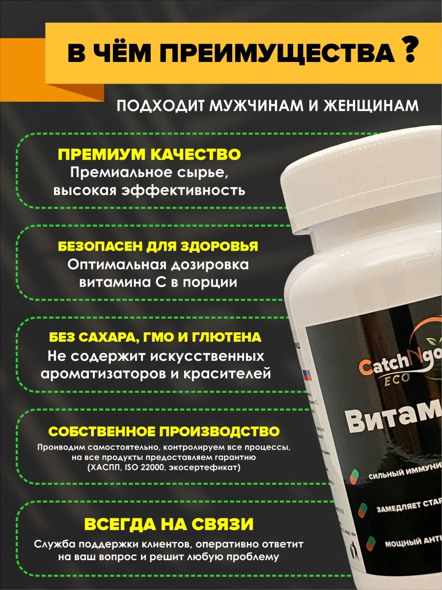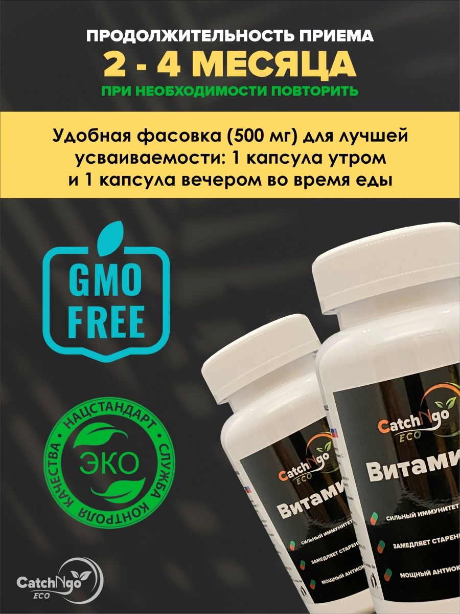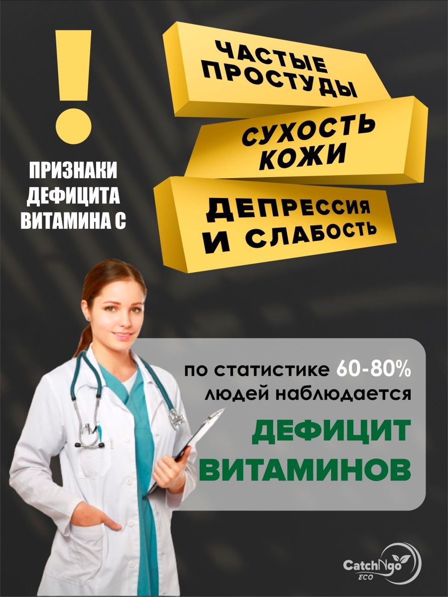 Витамин С от компании СatchNgo - комплексная пищевая добавка, представленная в форме капсул или порошка Этот водорастворимый витамин ц играет одну из самых важных ролей в организме, участвуя в множестве жизненно важных процессов. Является необходимым компонентом для выработки красных кровных клеток в костном мозге. Он также оказывает влияние на гемоглобин в крови, поддерживая его в хорошем состоянии. Благодаря этому, добавка к еде vitamin С-комплекс помогает поддерживать капилляры, десны, зубы, а также способствует заживлению ран и ожогов. Но VitaminС - это не только важный элемент для поддержания здоровья кровеносной системы. Он также является мощным антиоксидантом, помогающим вырабатывать антитела и увеличивающим число белых кровяных клеток, отвечающих за иммунитет. Это особенно важно в периоды обострения ОРВИ, когда организму требуется дополнительная защита. Но польза от него не ограничивается только поддержанием здоровья крови и иммунной системы. Он также способствует снижению уровня холестерина, предотвращает образование тромбов и болезней сердца, что в свою очередь уменьшает риск возникновения инсультов и инфарктов. Витамин С от СatchNgo также оказывает положительное влияние на сердце и сосуды, снижая давление и уровень мочевой кислоты. Он участвует в синтезе коллагена, который является основой строения кожи, сухожилий, хрящей и связок. Благодаря этому, добавка Витамин С помогает организму бороться с множеством воспалительных и инфекционных болезней. Все эти свойства ВитаминаС делают его незаменимым компонентом для поддержания здоровья и защиты организма. Будьте уверены в качестве продукции, приобретая Витамин С от СatchNgo - комплексную пищевую добавку, которая поможет вам поддерживать свое здоровье и иммунитет на высоком уровне. Витамин С помогает снизить симптомы артрита и предотвратить токсическое воздействие вирусов. Добавка защищает внутренние органы и ткани от повреждений различной этиологии, предотвращает образование злокачественных опухолей. Защищает сердце и сосуды, снижает давление и уровень мочевой кислоты. Участвует в синтезе коллагена, который является основой строения кожи, сухожилий, хрящей, связок. Витамин Ц помогает организму бороться со многими воспалительными и инфекционными болезнями. Он укрепит защитные силы организма во время осеннего обострения ОРВИ. Обладает противовоспалительными свойствами, способствует нейтрализации свободных радикалов и защите клеток легких от их агрессивного воздействия нормализует обмен веществ обеспечивает энергию укрепляет иммунитет Рекомендации по применению: принимайте 1 капсулу в день. В виде порошка принимайте следующим образом: смешать 1 (1 гр.) мерную ложку с 200 мл воды, принимать 1 раз в день после приема пищи. Продолжительность приема 2-4 месяца. Перед применением не забудьте проконсультироваться со специалистом.