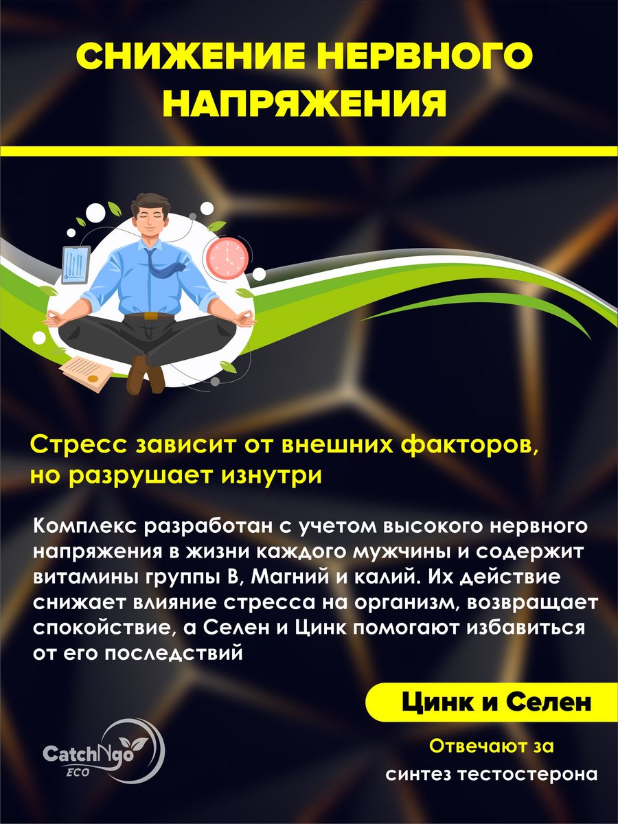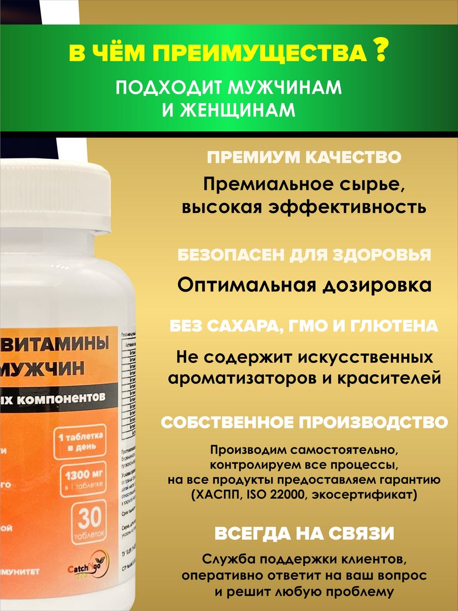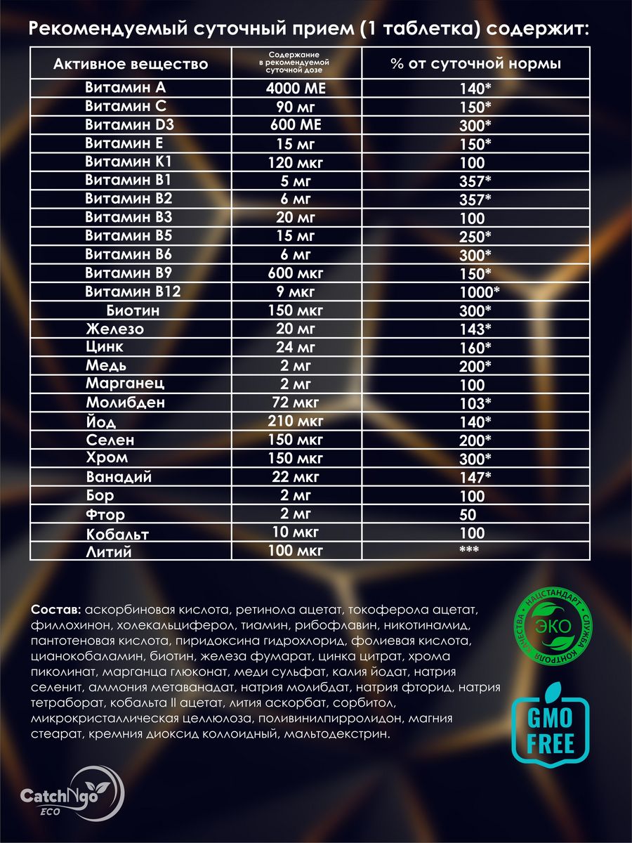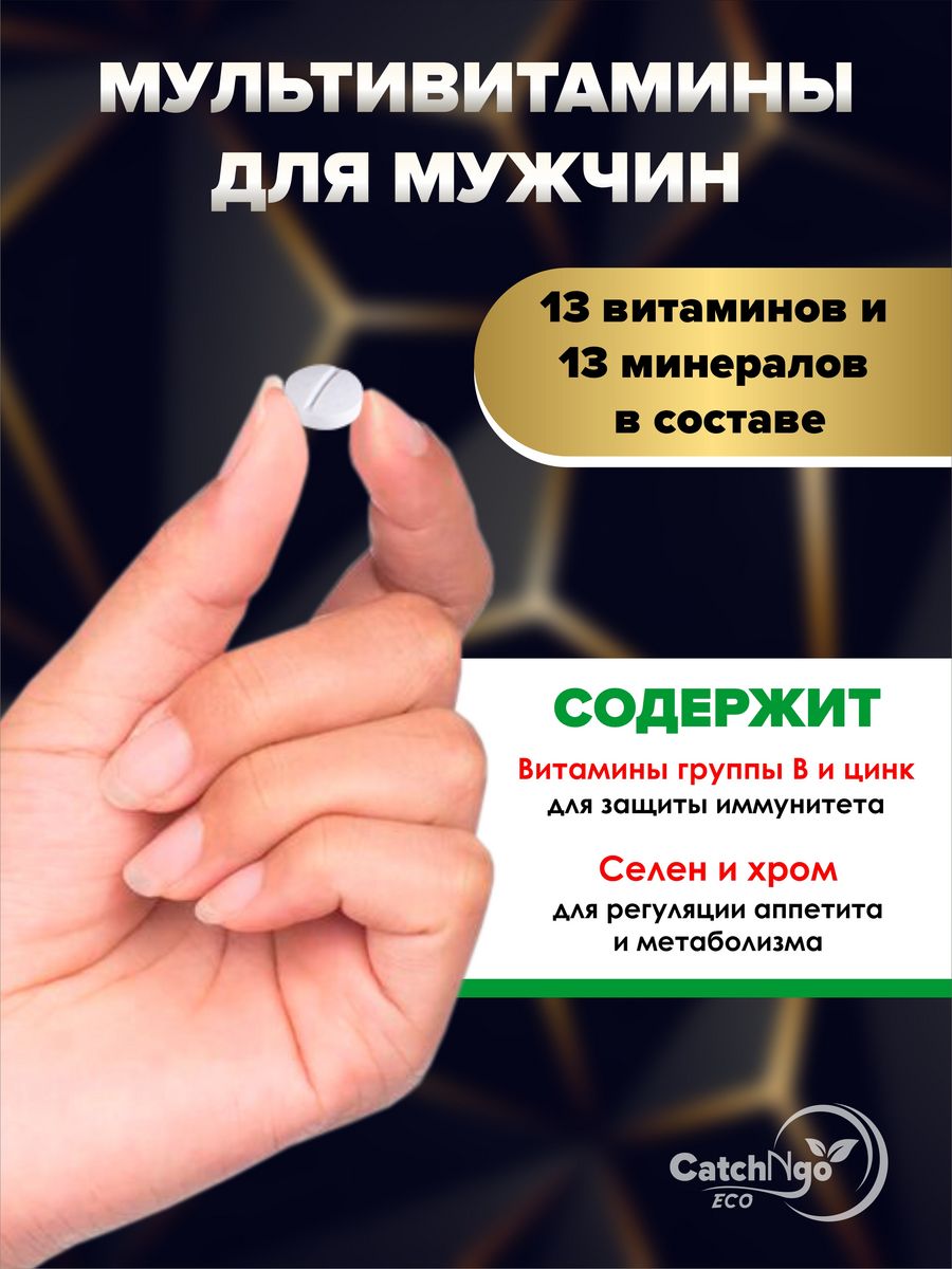 Хотите быть всегда на высоте? Хотите сохранить молодость и красоту? Тогда комплекс витаминов для мужчин CatchNGo - это то, что вам нужно! Наш уникальный продукт разработан с учетом физиологии мужчин и их особых потребностей. Витамины - это неотъемлемая часть здорового образа жизни. Они помогают поддерживать иммунитет, укреплять организм и бороться со стрессом. В составе нашего комплекса присутствуют все необходимые витамины и минералы, которые помогут вам чувствовать себя настоящим мужчиной. Витамин А - это витамин красоты и здоровья кожи. Он помогает сохранить ее упругость и эластичность, а также способствует замедлению процесса старения. Витамин C - это витамин иммунитета. Он повышает устойчивость организма к инфекциям и вирусам, а также улучшает работу сердечно-сосудистой системы. Витамин D3 - это витамин костей и зубов. Он укрепляет кости, способствует их росту и развитию, а также улучшает состояние зубов. Витамин Е - это витамин молодости. Он помогает замедлить процесс старения, улучшает состояние кожи и волос, а также способствует нормализации работы половой системы. Витамин K1 - это витамин свертываемости крови. Он помогает предотвратить кровотечения и улучшает состояние сосудов. Витамины группы B - это витамины энергии. Они улучшают обмен веществ, повышают работоспособность и улучшают настроение. Биотин - это витамин красоты волос и ногтей. Он способствует укреплению и росту волос, а также улучшает состояние ногтей. Минералы - это неотъемлемая часть здорового питания. Они помогают поддерживать равновесие в организме и улучшают его функционирование. Железо - это минерал, который участвует в образовании гемоглобина и транспортирует кислород по организму. Цинк - это минерал, который улучшает иммунитет, способствует здоровью простаты и улучшает состояние кожи. Медь - это минерал, который участвует в образовании коллагена и эластина, что способствует сохранению молодости кожи. Марганец - это минерал, который участвует в образовании костей и хрящей, а также в обмене веществ. Молибден - это минерал, который участвует в обмене аминокислот и улучшает работу печени. Йод - это минерал, который необходим для нормального функционирования щитовидной железы и обмена веществ. Селен - это минерал, который улучшает иммунитет, способствует здоровью сердца и сосудов, а также защищает клетки от свободных радикалов. Хром - это минерал, который улучшает обмен веществ, способствует снижению аппетита и поддержанию нормального уровня сахара в крови. Ванадий - это минерал, который улучшает работу инсулина и способствует нормализации уровня сахара в крови. Бор - это минерал, который улучшает состояние костей и суставов, а также способствует нормализации гормонального баланса. Фтор - это минерал, который улучшает состояние зубов и защищает их от кариеса. Кобальт - это минерал, который улучшает образование эритроцитов и способствует нормализации работы нервной системы. Литий - это минерал, который улучшает настроение, способствует снятию стресса и улучшает работу мозга. Мужские витамины CatchNGo - это комплекс витаминов, разработанный специально для мужчин. Они содержат все необходимые витамины и минералы, которые помогут вам сохранить здоровье и молодость. Наш продукт подойдет как для спортсменов, так и для людей, ведущих здоровый образ жизни. Он помо